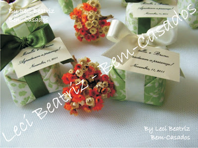 Bem-Casados preparados para a recepção de Mirella e Bruno. Eles foram embalados em celofane, tecido de algodão de qualidade, com padronagem floral nas cores creme com fundo verde clarinho, composto com verde clarinho e creme, foram amarradinhos com fitinhas lisas, de cetim, número 3, nas cores marfim e verde, respectivamente, na finalização aplicamos a TAG desenvolvida por nós, impressa em papel Órion Acetinado, 250g.